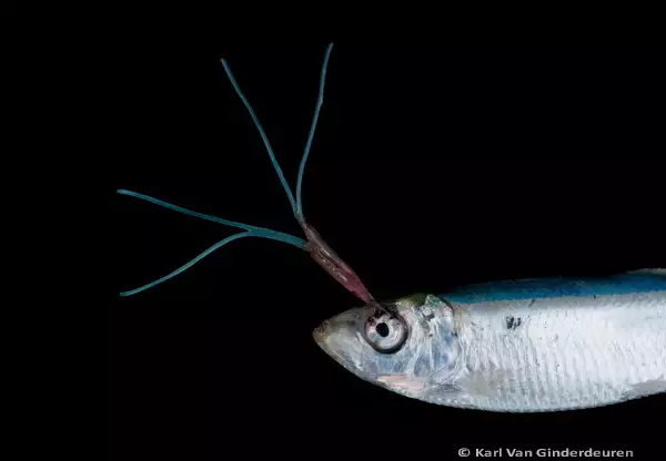 Sprat with two Lernaeenicus sprattae parasites. These parasitic copepods (red) carry two egg sacs each (blue) and survive on sprat tissue and fluids.